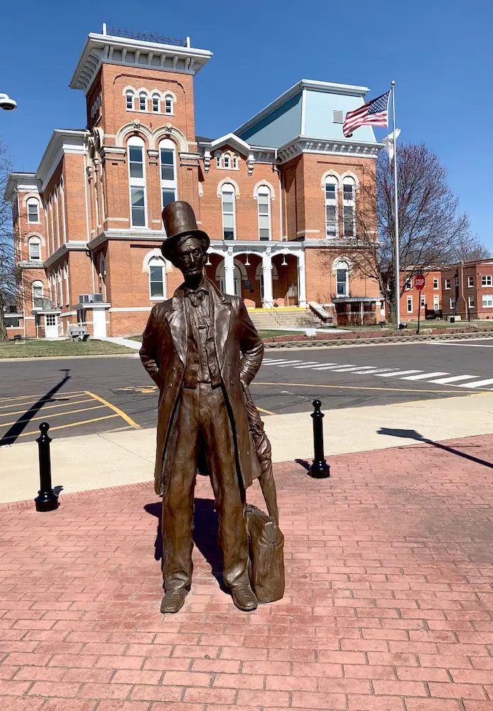 The statue's title, Among Friends, recognizes the many friends Lincoln had in Hillsboro, where he often stopped and stayed overnight during trips from New Salem to Vandalia, then the state capital.