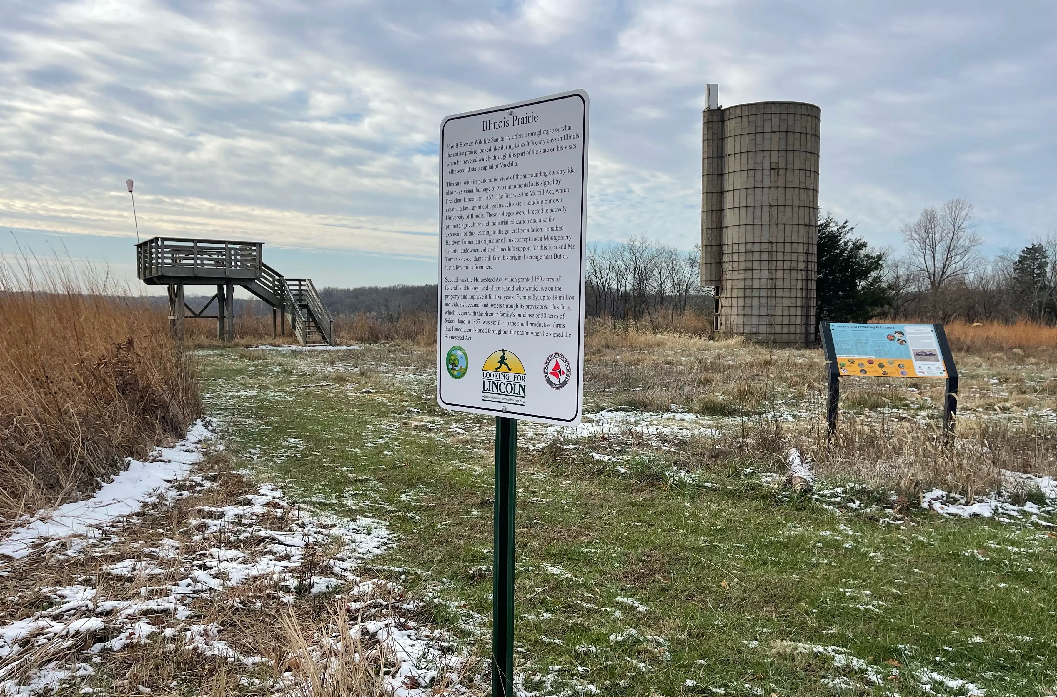 This site, with its panoramic view of the surrounding countryside, also pays visual homage to two monumental acts signed by President Lincoln in 1862. The first was the Morrill Act, which created a land grant college in each state, including our own University of Illinois. These colleges were directed to actively promote agriculture and industrial education and also the extension of this learning to the general population. Jonathan Baldwin Turner, an originator of this concept and a Montgomery County landowner, enlisted Lincoln's support for this idea, and Mr. Turner's descendants still farm his original acreage near Butler, just a few miles from here.